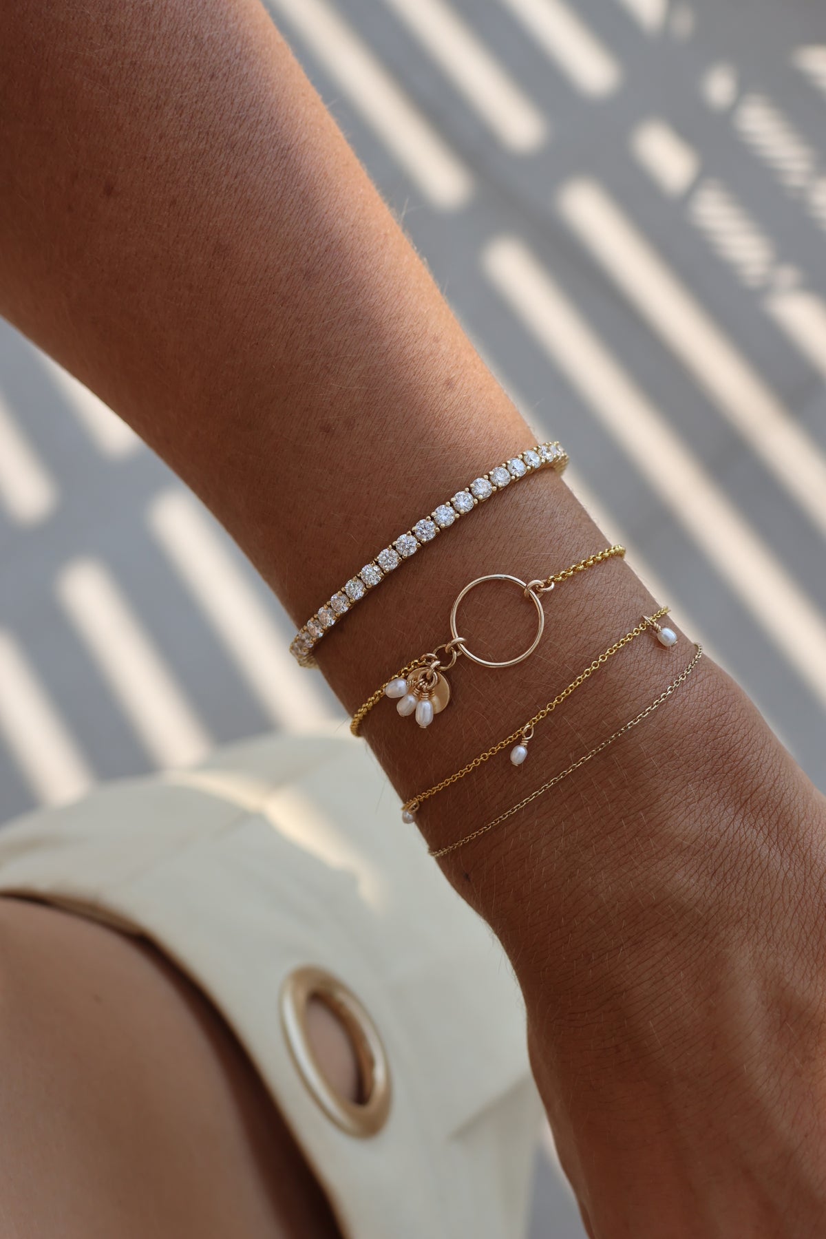 The perfect golden accessory, this 14k gold-filled fine rolo chain bracelet sits elegantly in the contours of the wrist and features a hoop centrepiece with small flat disc and three Freshwater Pearl details.